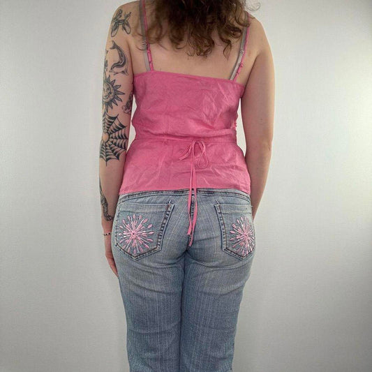 Y2K vintage 100% linen cami top adjustable bow beaded embroidered stripes v neck