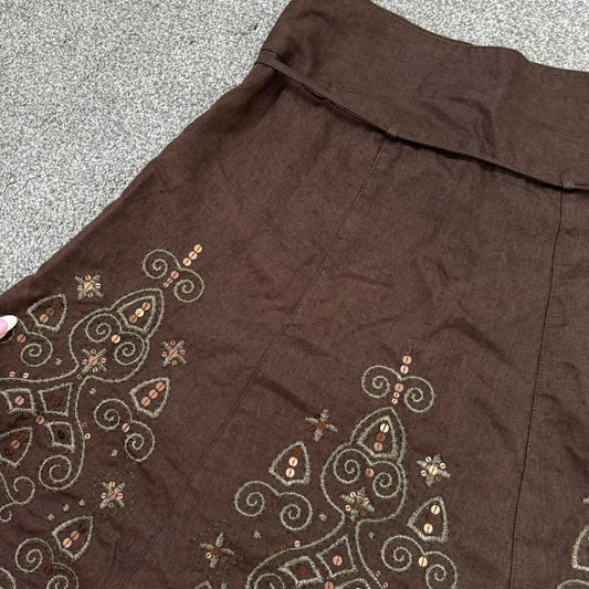 Y2K vintage 100% pure linen a line midi skirt sequin embroidered pattern bow