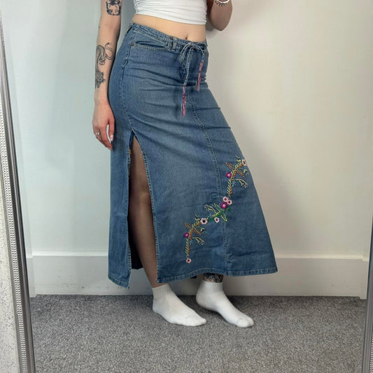 90s Y2K vintage floral embroidery denim maxi skirt thigh split belt light blue