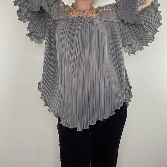 Vintage 70s Janice Wainwright silk floral embroidered pleated floaty blouse top
