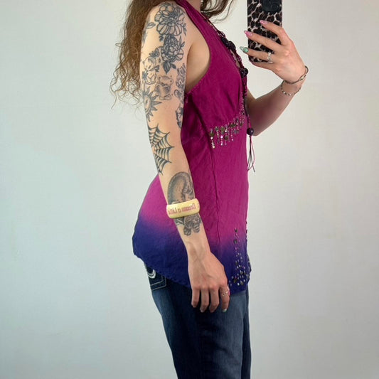 Y2K vintage 100% linen halter neck beaded sequin top v neck boho embellished M