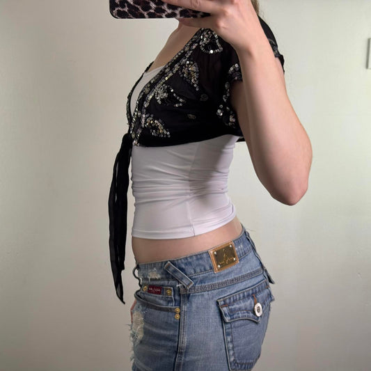 Y2K vintage 100% silk cropped cardigan shrug sheer beaded sequin bow embellished