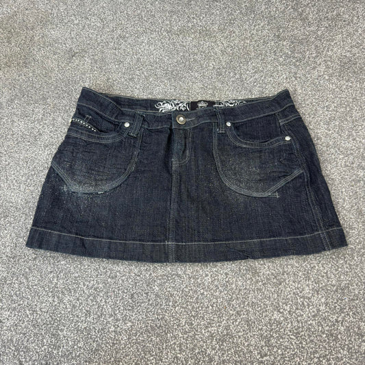 Y2K vintage denim mini skirt dark wash faded rhinestone mid rise