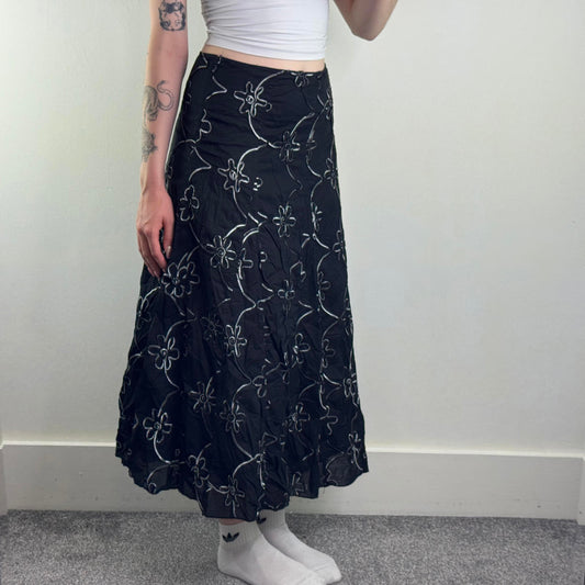 Y2K vintage floral embroidered maxi skirt a line black white flower pattern