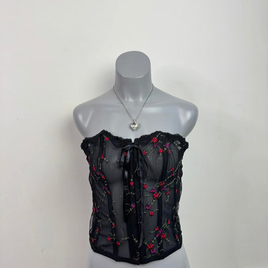 Y2K vintage Evie boned mesh corset bustier top strapless floral embroidered- L