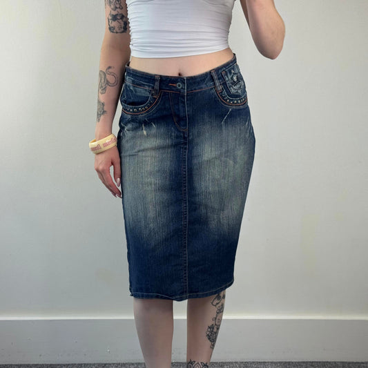 Y2K vintage faded denim crown embroidered midi skirt knee length studded