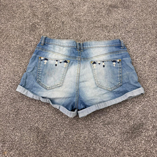 Y2K vintage low rise faded denim mini shorts embroidered aztec 2010s turned hem