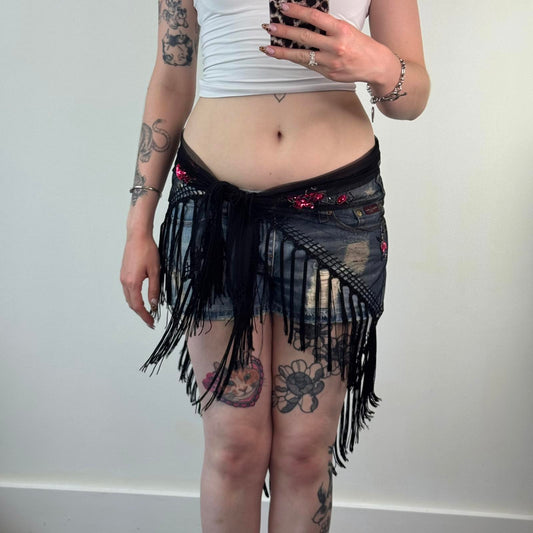 Y2K vintage low rise denim mini skirt number 8 chainmail embroidered a line rara