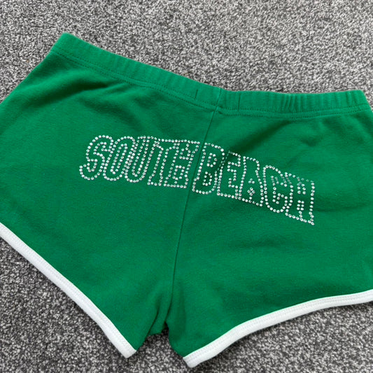 Y2K vintage low rise sporty rhinestone mini shorts jersey green white stretchy