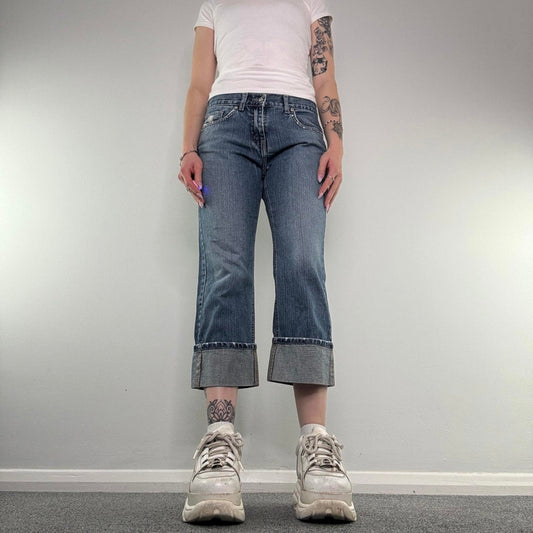 Y2K vintage rhinestone capri cropped jeans turned up hem light wash distressed