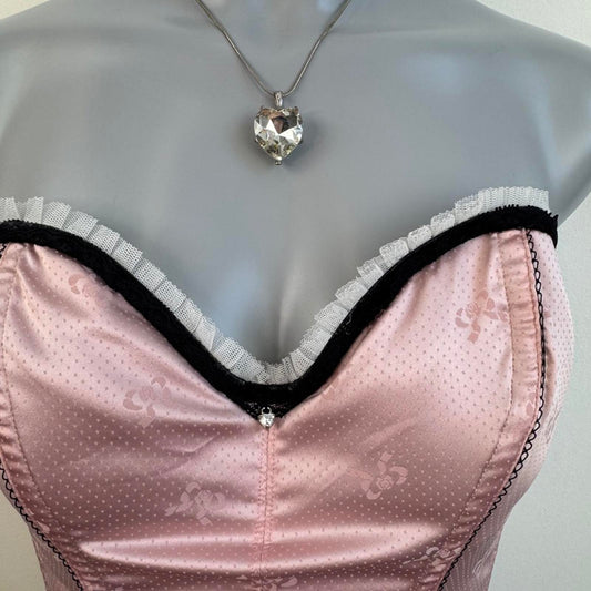 Y2K vintage satin bow baby pink corset strapless boned v neck rhinestone frilly