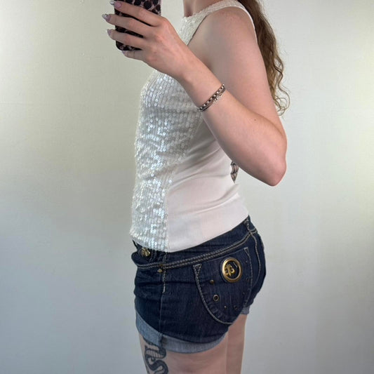 Y2K vintage sequin embellished high neck tank top bow stretchy white
