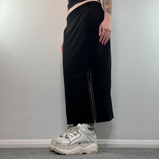 Y2K vintage rhinestone maxi skirt thigh side slit a line tailored black