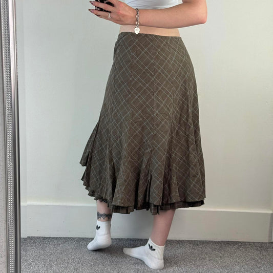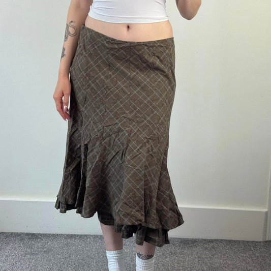 Y2K vintage tartan frill midi skirt ruffle a line khaki blue floral embroidery