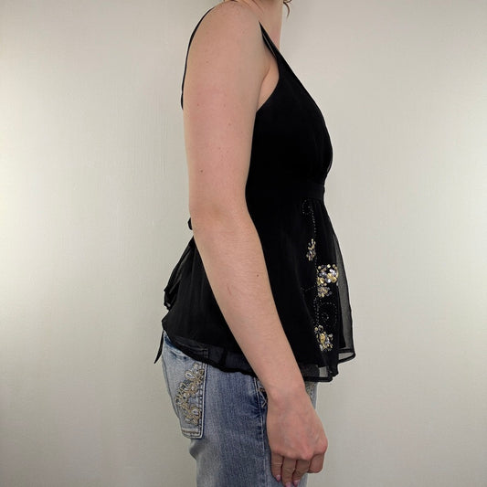 Y2K vintage silk top beaded floral embellished v neck sequin cinched satin trim