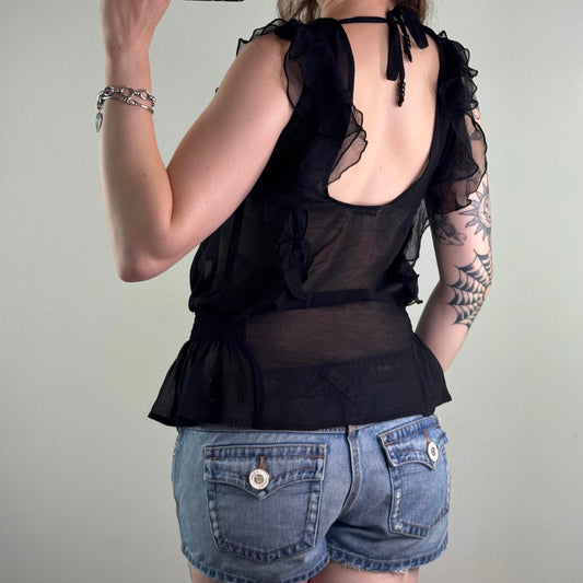Y2K vintage sheer sequin top frill gold embellished open back bow black party