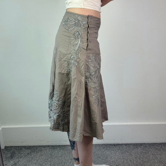 Y2K vintage stripe floral embroidered midi skirt a line button up 100% cotton