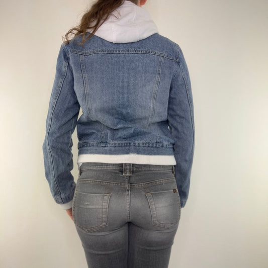 Y2K vintage denim jacket with built in zip up hoodie