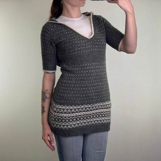 Y2K vintage knitted hoodie short sleeve aztec pattern v neck grey white