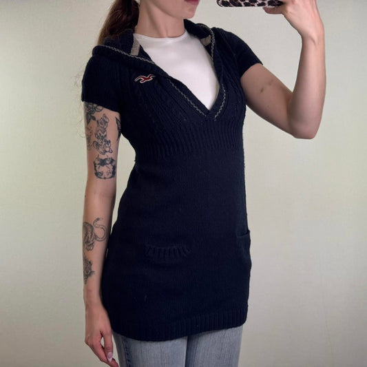 Y2K vintage Hollister knit short sleeve hoodie v neck cable knit navy knitted