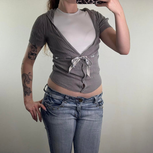 Y2K vintage fine knit short sleeve hoodie bow deep v neck low cut button up