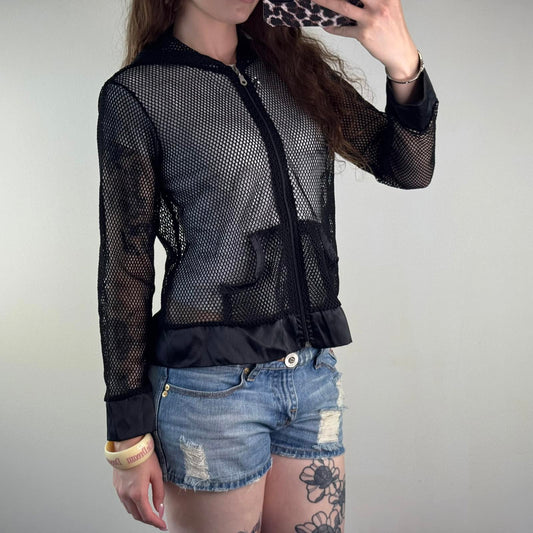 Y2K vintage fishnet mesh perforated zip up hoodie lightweight sheer see through