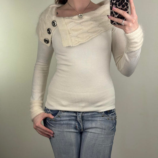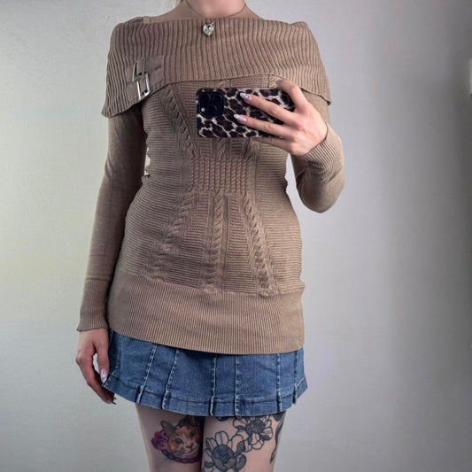 Vintage Jane Norman off the shoulder bardot fine knit jumper buckles cable beige
