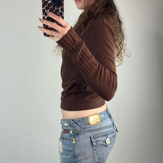 Y2K vintage fine knit roll neck jumper lightweight buttons ribbed brown