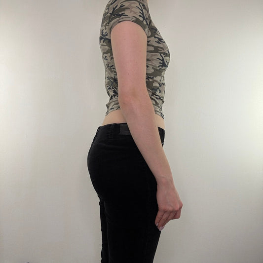 Y2K vintage camo mesh top baby tee cropped v neck fine mesh