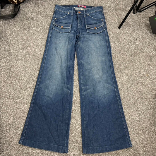 Y2K vintage mid rise wide leg denim jeans stretchy mid blue wash cargo baggy