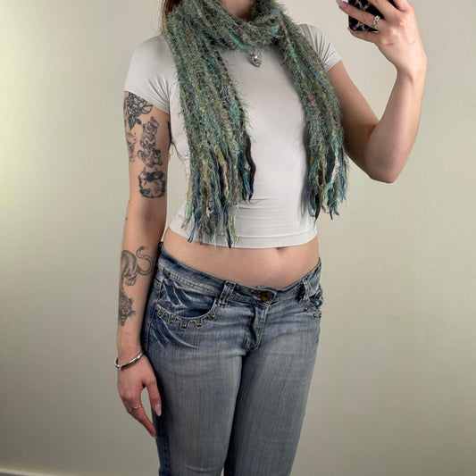 Y2K vintage fine knit stripe scarf lightweight sheer glittery sparkly grey black