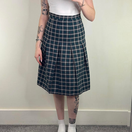 Y2K vintage 100% wool check tartan midi skirt a line lined blue green white