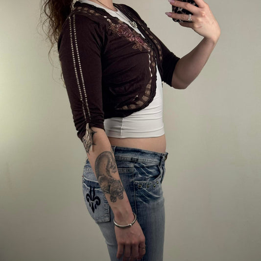 Y2K vintage Karen Millen cropped cardigan 3/4 sleeve ribbon floral embroidered