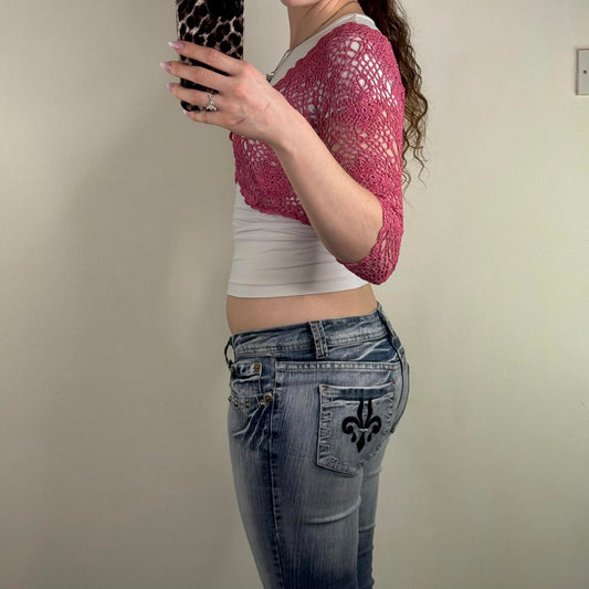 Y2K vintage Principles crochet cropped cardigan floral knit bow sheer 3/4 sleeve