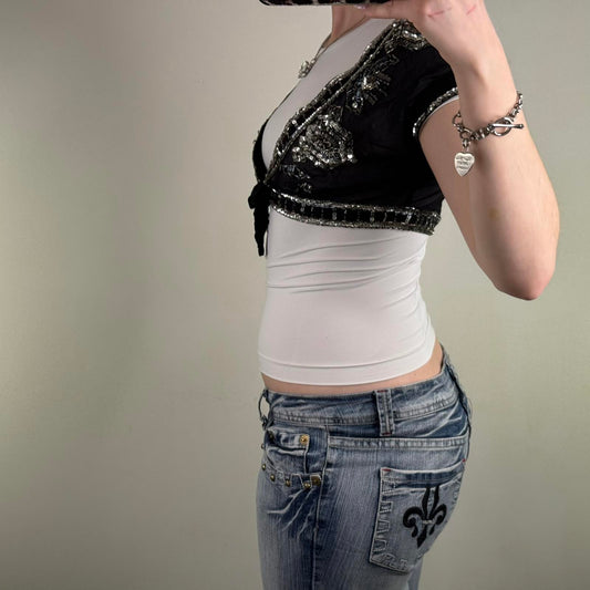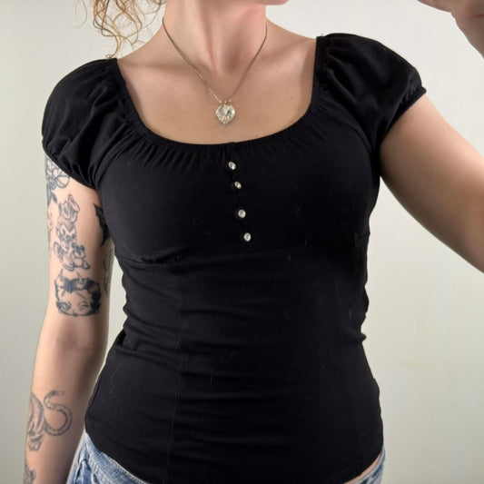 Y2K vintage milkmaid top cap sleeve rhinestone ruched bust flattering fitted