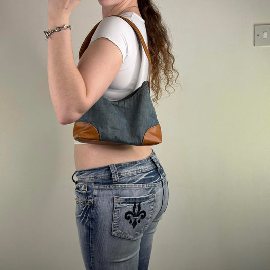 Y2K vintage denim faux leather mini shoulder bag zipper closure small blue brown