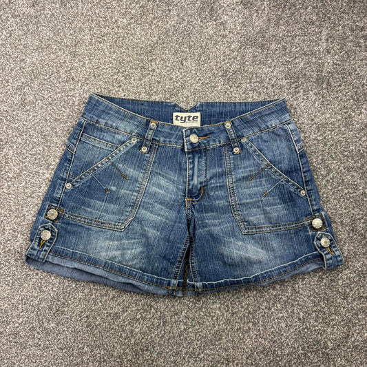 Y2K vintage low rise stretchy denim mini shorts faded blue wash studded cargo