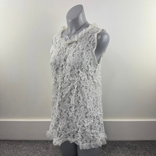 True vintage lace sheer long blouse sleeveless ruffle hem floral white coquette