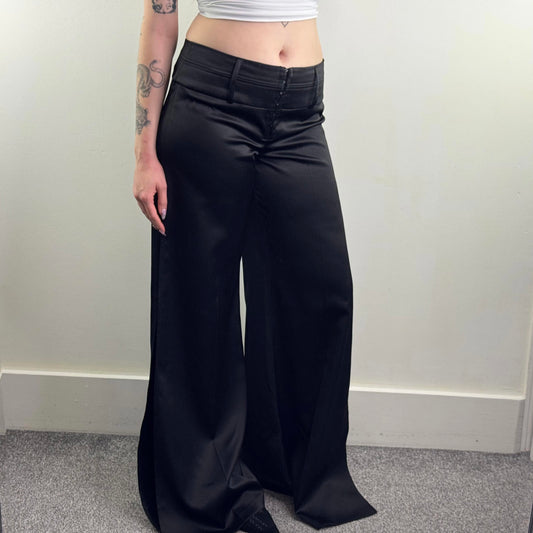 Y2K vintage satin flare wide leg trousers hook and eye mid rise high thigh slit