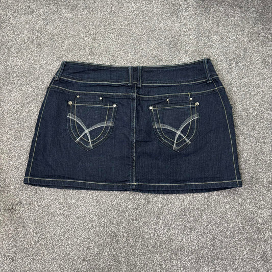 Y2K vintage low rise denim mini skirt dark blue navy wash gold stretchy