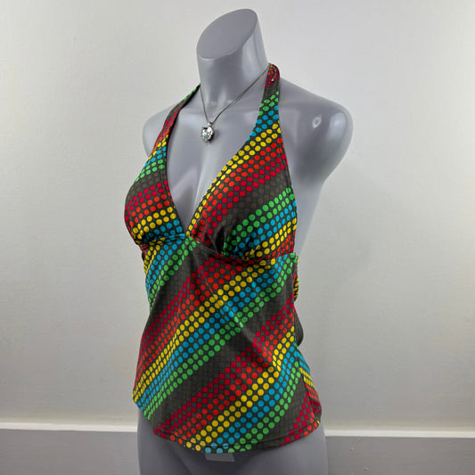 Y2K vintage polka dot halter neck swimwear top v neck padded cups multi rainbow