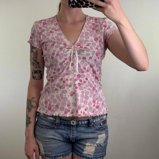 Y2K vintage polka top t shirt top v neck ruched bow short sleeve lettuce hem