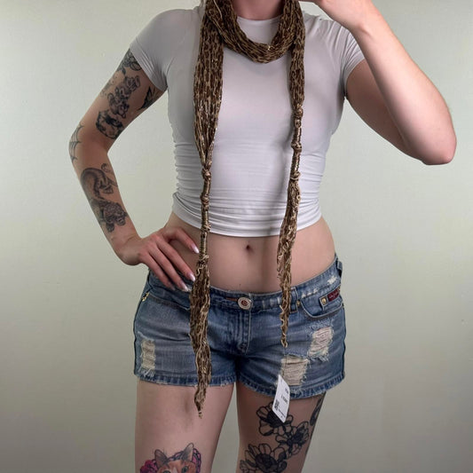 Y2K vintage crochet skinny scarf sequin gold knit thin