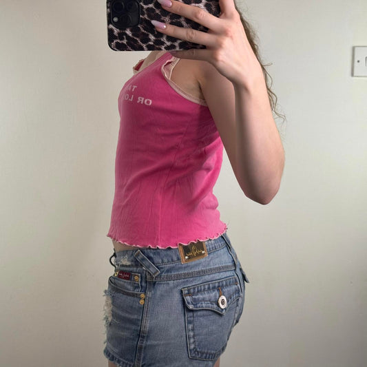 Y2K vintage slogan tank top lace trim lettuce hem hot baby pink round neck