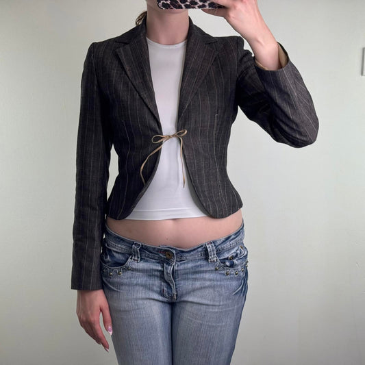 Y2K vintage pinstripe crop blazer bow open front shoulder pads tailored office