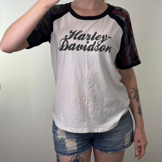 Y2K vintage Harley Davidson short sleeve t shirt studded USA flag baseball top