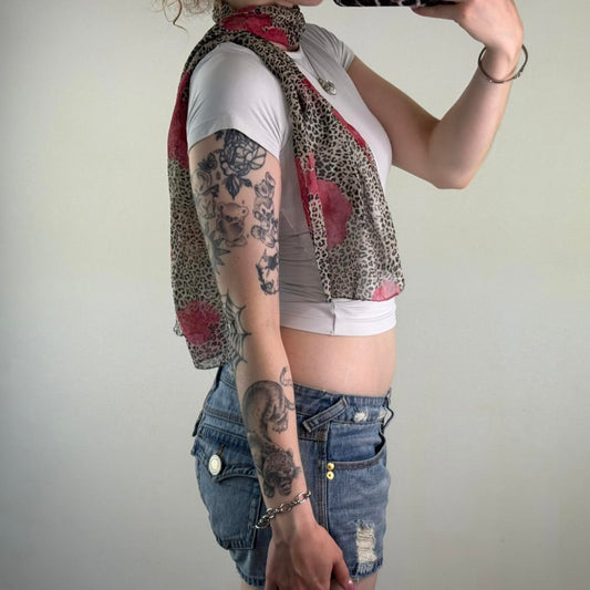 Y2K vintage leopard print hibiscus floral scarf sheer short pink cream short
