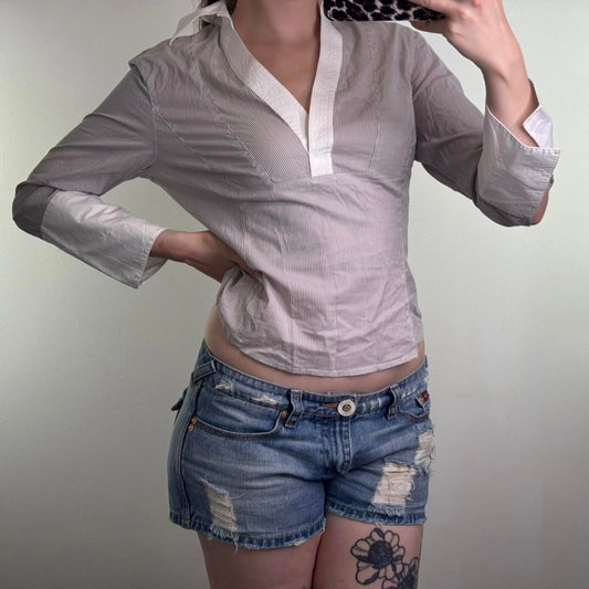 Y2K vintage pinstripe tailored fitted shirt blouse flare sleeve v neck stripe
