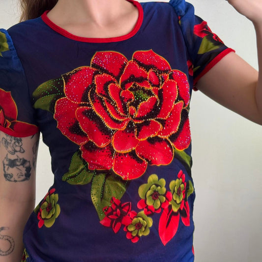 Y2K vintage double mesh stretchy t shirt top rose floral studded puff sleeve