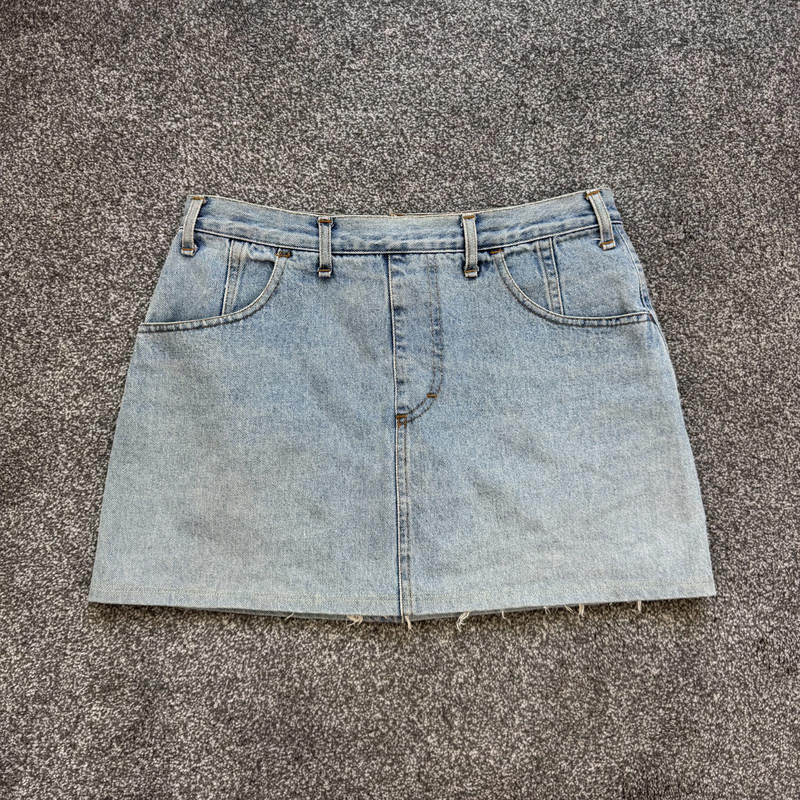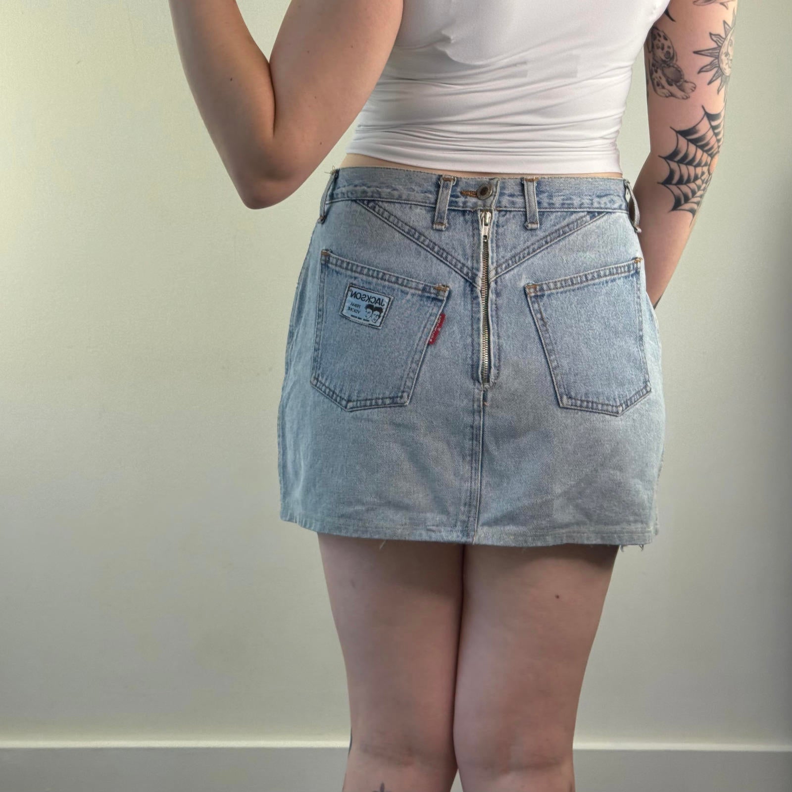 90s Y2K vintage denim mini skirt zipper fraying hem light blue wash mid rise